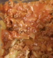 Spread the cabbage in the bottom of a 2 quart casserole dish. Cover with the meat mixture. Pour the soup over the top.